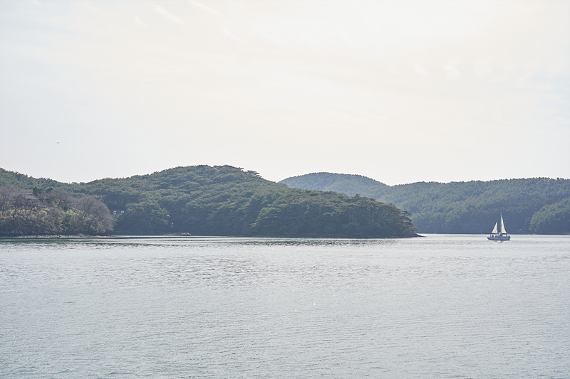 제승당 선착장과 다른 방향으로 움직이는 요트(?)가 한척 보입니다. 멋있게 보입니다.