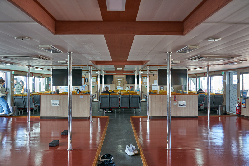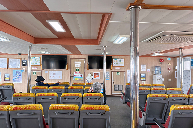 여객선 안은 바닥에 앉을 수 있는 자리와 의자가 있습니다. 손님들이 많지 않으니 원하는 자리를 선택할 수 있습니다.