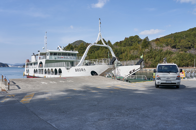 제승당 선착장에 도착했습니다. 승객이 먼저 내리리지만 차량들도 비슷하게 나옵니다. 선착장 앞에 마을버스가 한대 서있습니다. 배 도착시간과 맞춰서 운행하나 봅니다.