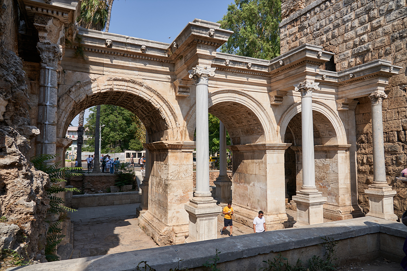 골목길을 걸어서 하드리아누스 문에 도착했습니다. '하드리아누스의 문(Hadrian Kapısı)'은 130년 로마 성군이었던 하드리아누스 황제가 안탈리아를 방문한 것을 기념해 세워진 문입니다. 지면보다 3m 낮은 위치에 있고 3개의 아치와 4개의 이오니아식 기둥으로 세워졌습니다. 성벽의 출입구이면서 안탈리아 구시가지로 들어서는 대문의 역할을 하였다고 합니다.