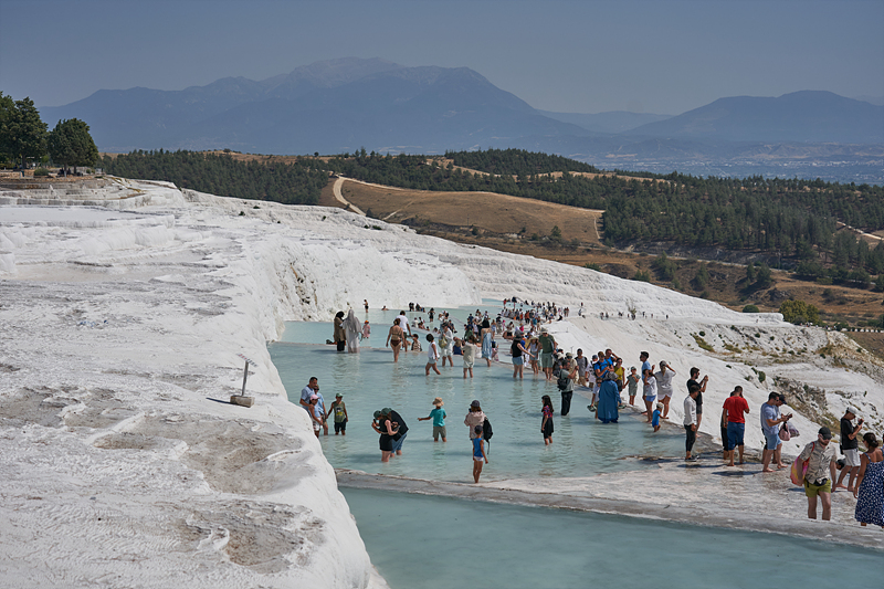 바닥에 이끼가 끼어 있어 많이 미끄럽습니다. 조심해서 걷지 않으면 넘어질 것 같습니다. 그런데 오늘 햇빛이 무지 강한 날인데 사람들이 많이 붐비는 곳을 걸어 다녀야 하니 양산을 쓸 수 없습니다. 그런데 하얀 석회석에 반사되는 열기가 만만치 않습니다. 무지 더운 곳입니다. 더위와 바닥의 미끄럼 때문에 걷는 일이 쉽지는 않지만 많이 기대한 곳이니 힘들어도 발걸음을 조심스럽게 떼며 움직여야 합니다.