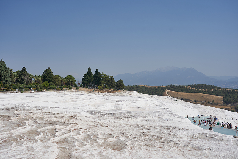 파묵칼레(Pamukkale)는 하얀 석회층이 낮은 산을 목화솜처럼 감싸고 있는 풍경으로 유명한 곳입니다. 석회성분이 포함된 지하수가 언덕을 흐르며 침전된 석회언덕이 형성되었습니다. 석회층 위에 있는 고대도시 히에라폴리스 유적을 포함해서 1988년 유네스코 세계유산으로 지정되었다고 합니다.