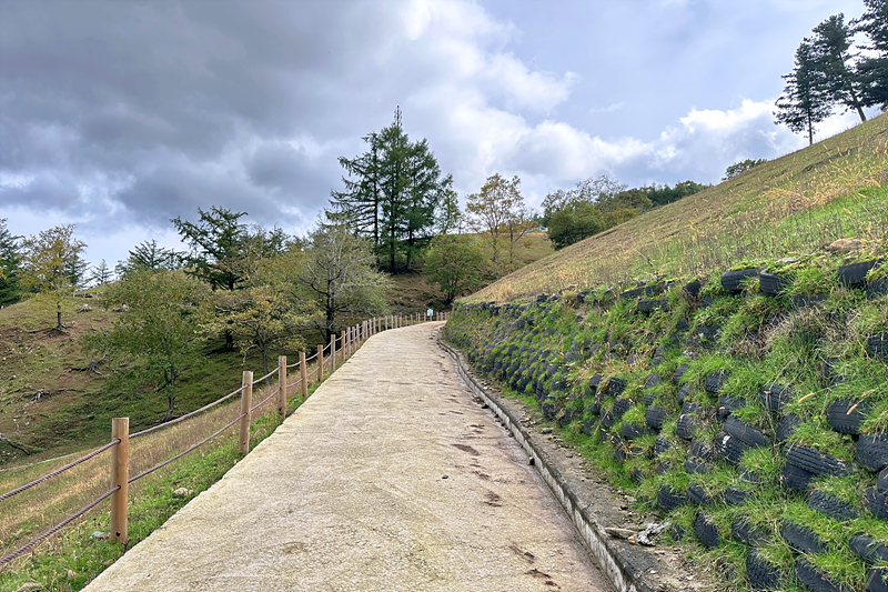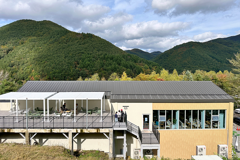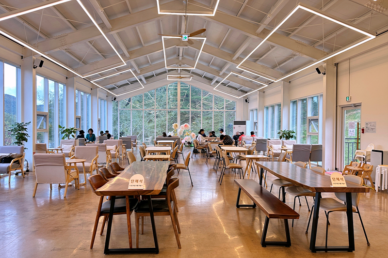 사슴목장으로 나타는 외부에도 테이블이 있습니다. 하지만 기온이 조금 내려간 상황이라 오늘 날씨에 앉아 있기는 부담스럽습니다. 실외 좌석을 지나면 사슴목장으로 가는 길이 이어집니다.