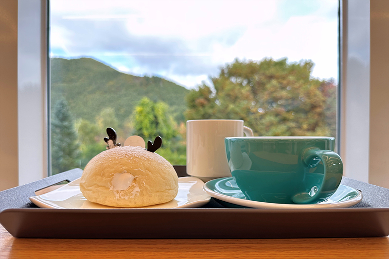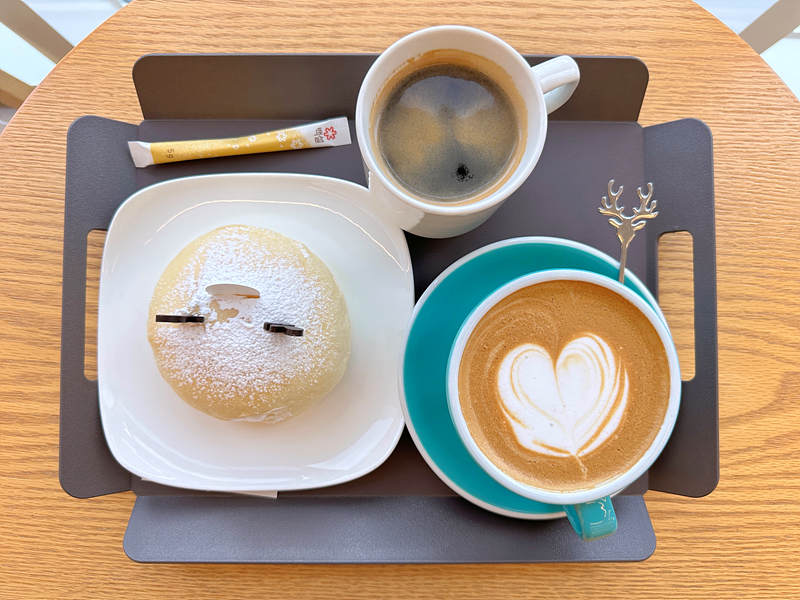 시그니처 메뉴를 마셔보고 싶었지만 ice로만 된다길래 따뜻한 음료를 찾다가 카페라떼와 아메리카노를 주문했습니다. 그리고 귀엽게 생긴 초록뿔 꽃사슴빵도 하나 추가했습니다. 창가 쪽에 빈자리가 있길래 자리 잡았습니다. 아침에 태백산 하늘전망대에 들렀을 때보다 하늘이 조금 맑아졌습니다.